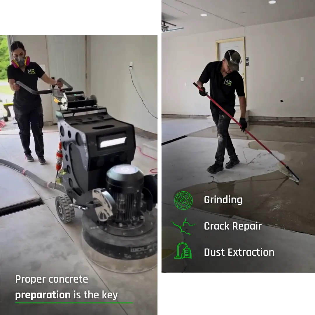 We repair cracks, pitting, imperfections then grind the floor smooth and install our epoxy flooring system.